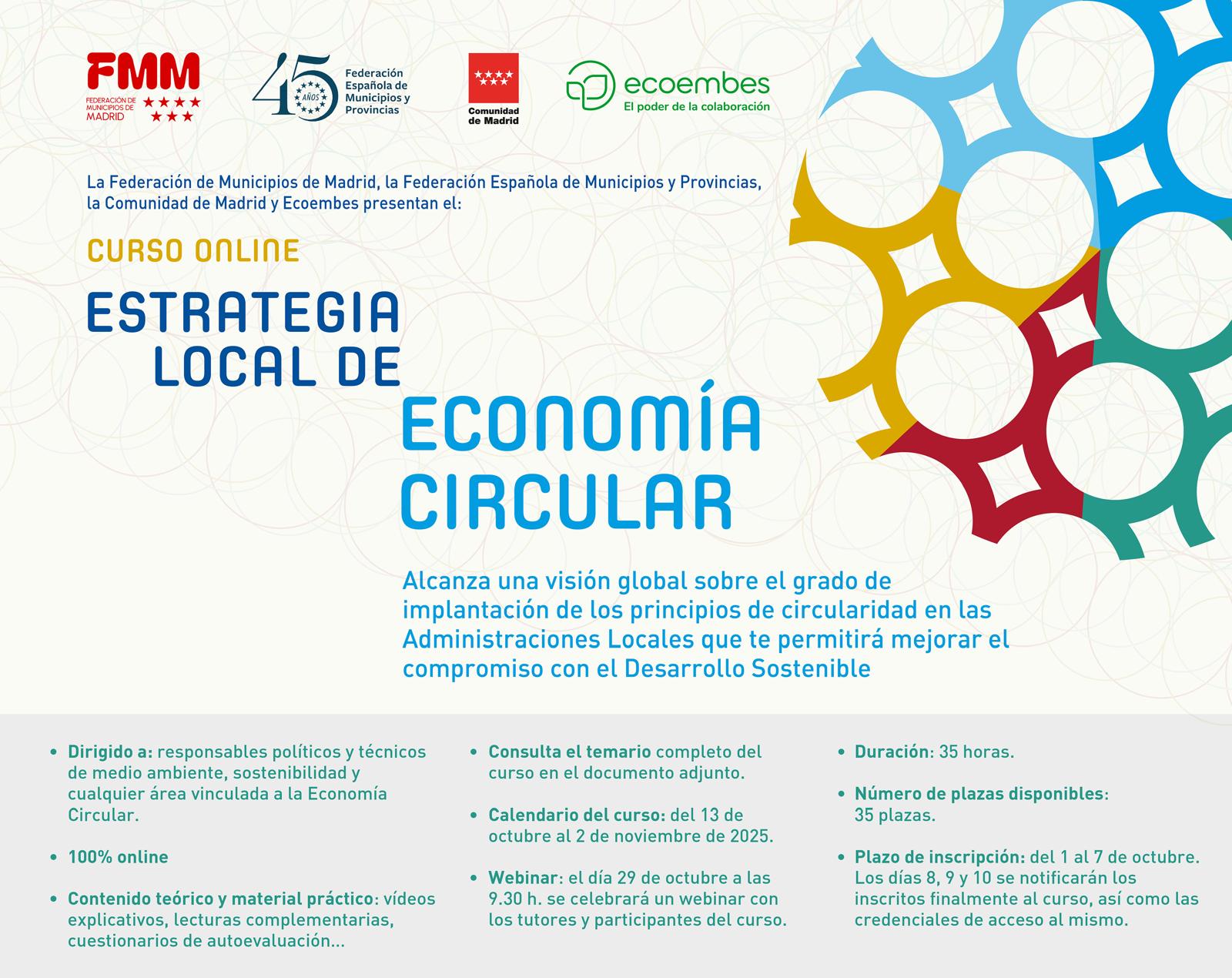 La Federación de Municipios de Madrid, en colaboración con la FEMP, la Comunidad de Madrid y Ecoembes, organiza el curso online “Estrategia Local de Economía Circular”, dirigido a responsables políticos y técnicos vinculados al medio ambiente, la sostenibilidad y cualquier área relacionada con la economía circular.